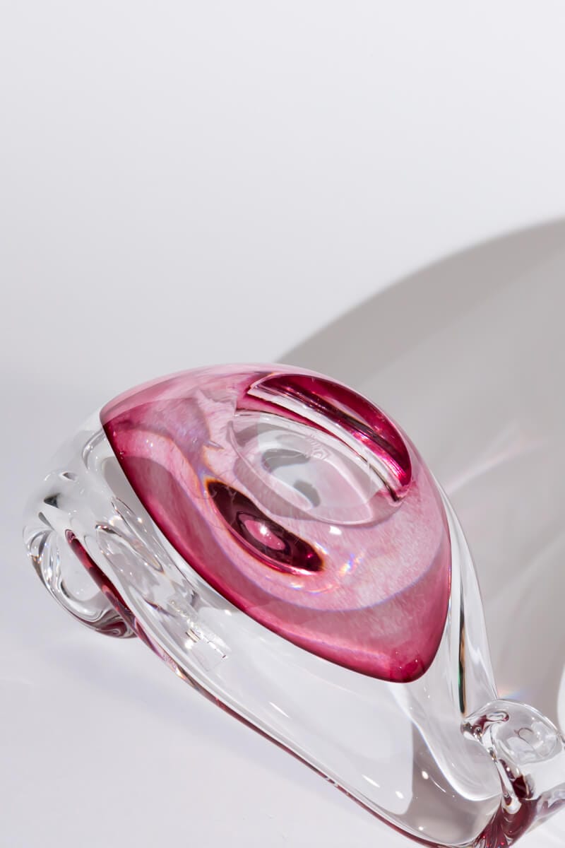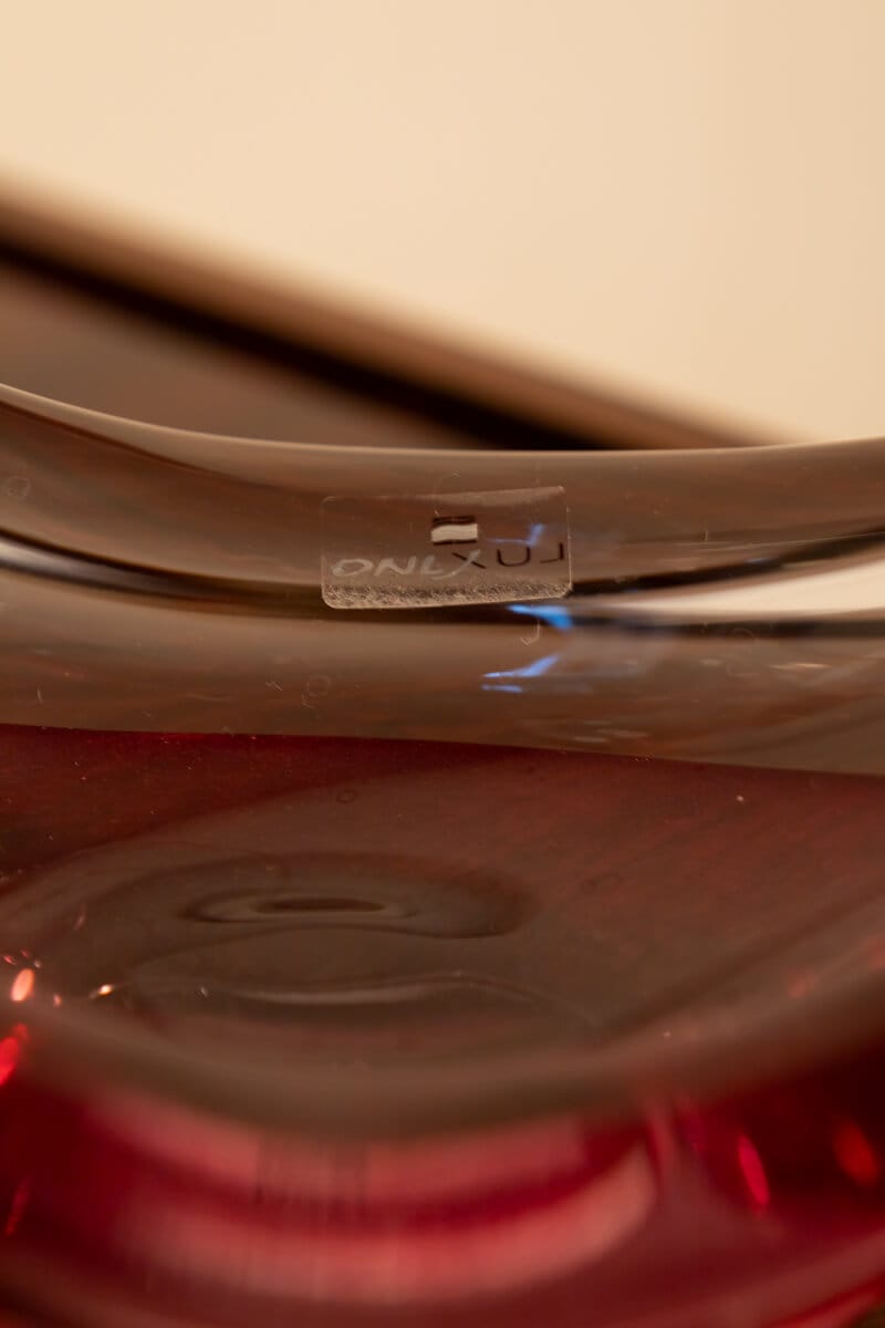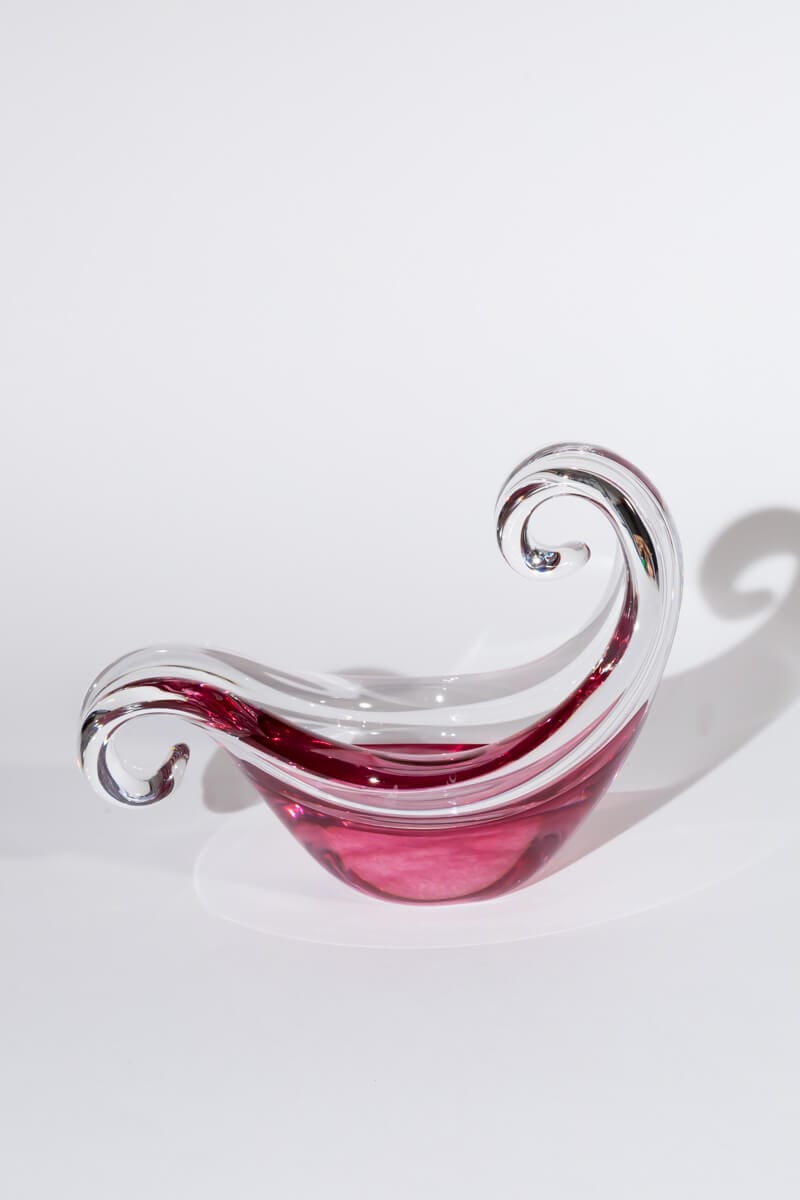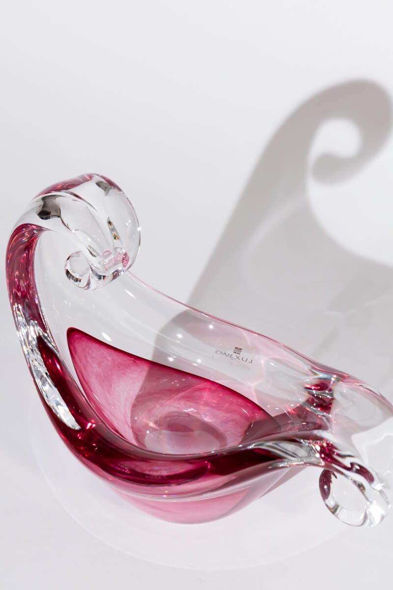 Elevate your décor with this exquisite sculptural art glass bowl, handcrafted by Italian company ONLLUX in Florence, using ancient Murano glassmaking techniques. This gondola-shaped masterpiece features an organic, fluid silhouette in a stunning raspberry pink and clear glass combination, showcasing exceptional craftsmanship.
