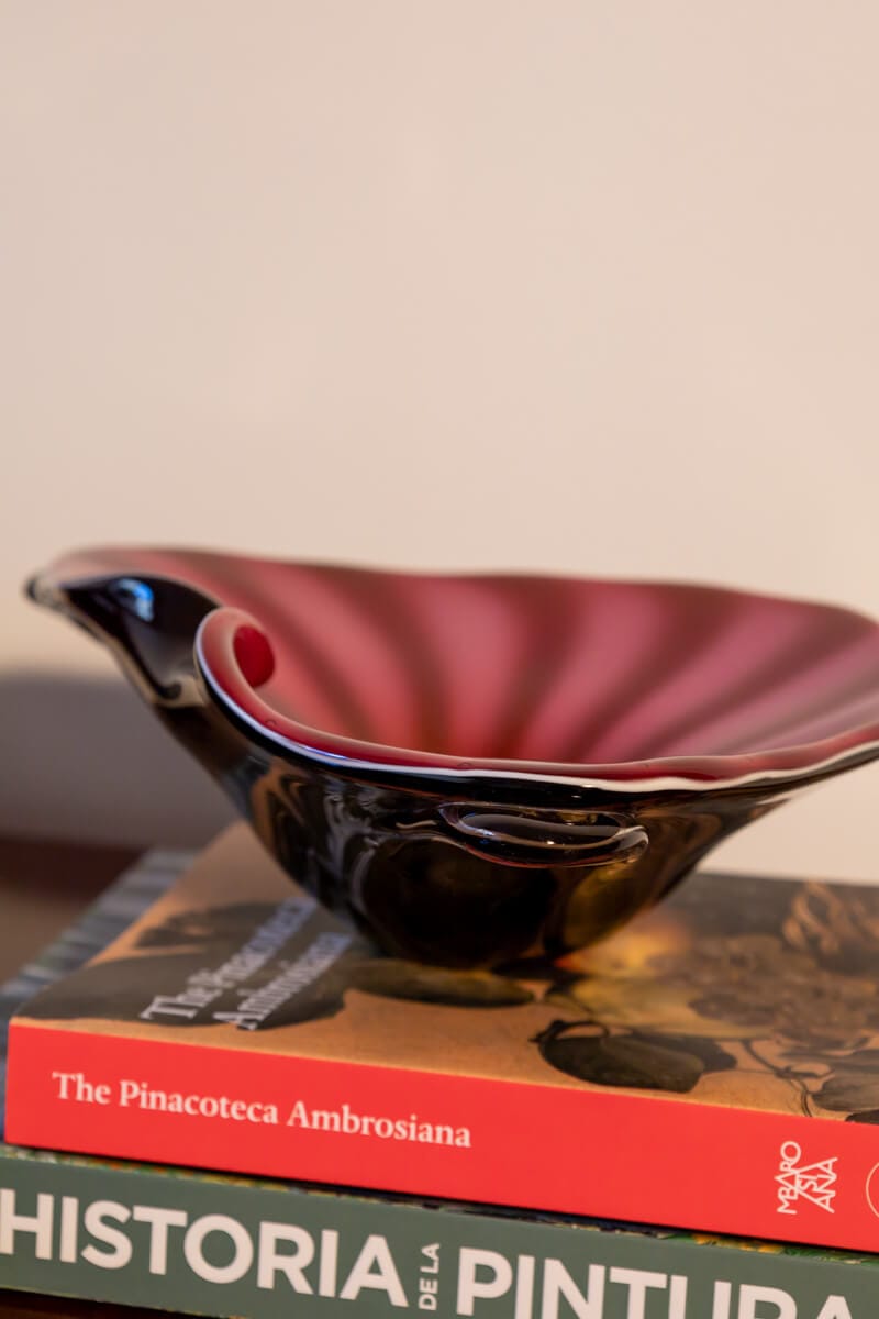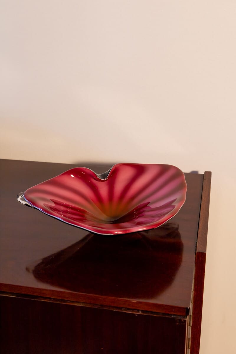 Add a bold statement to your décor with this spectacular mid-century Bohemian opaline glass bowl. Crafted using the intricate Sommerso technique, the bowl showcases two rich tones—dark burgundy and raspberry pink—interlaced in a striking striped pattern.