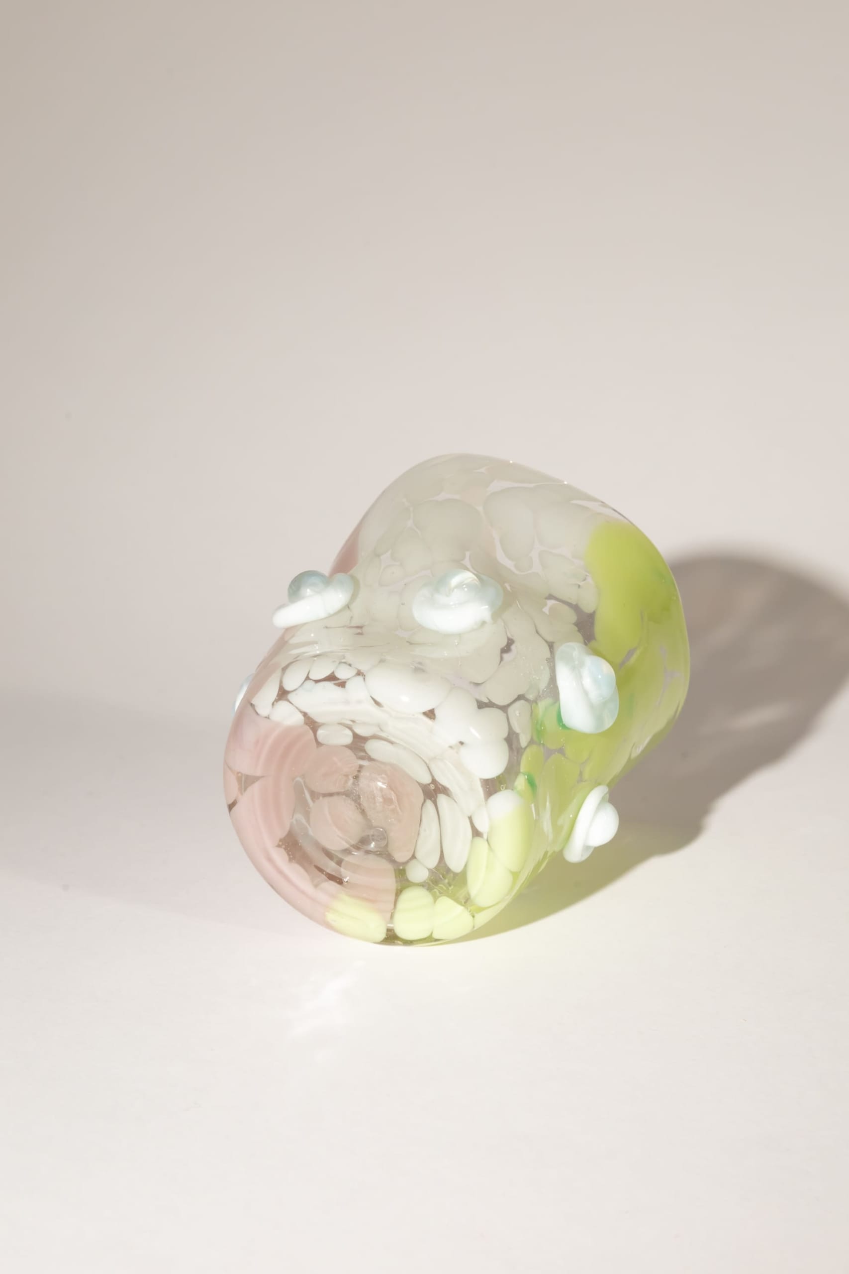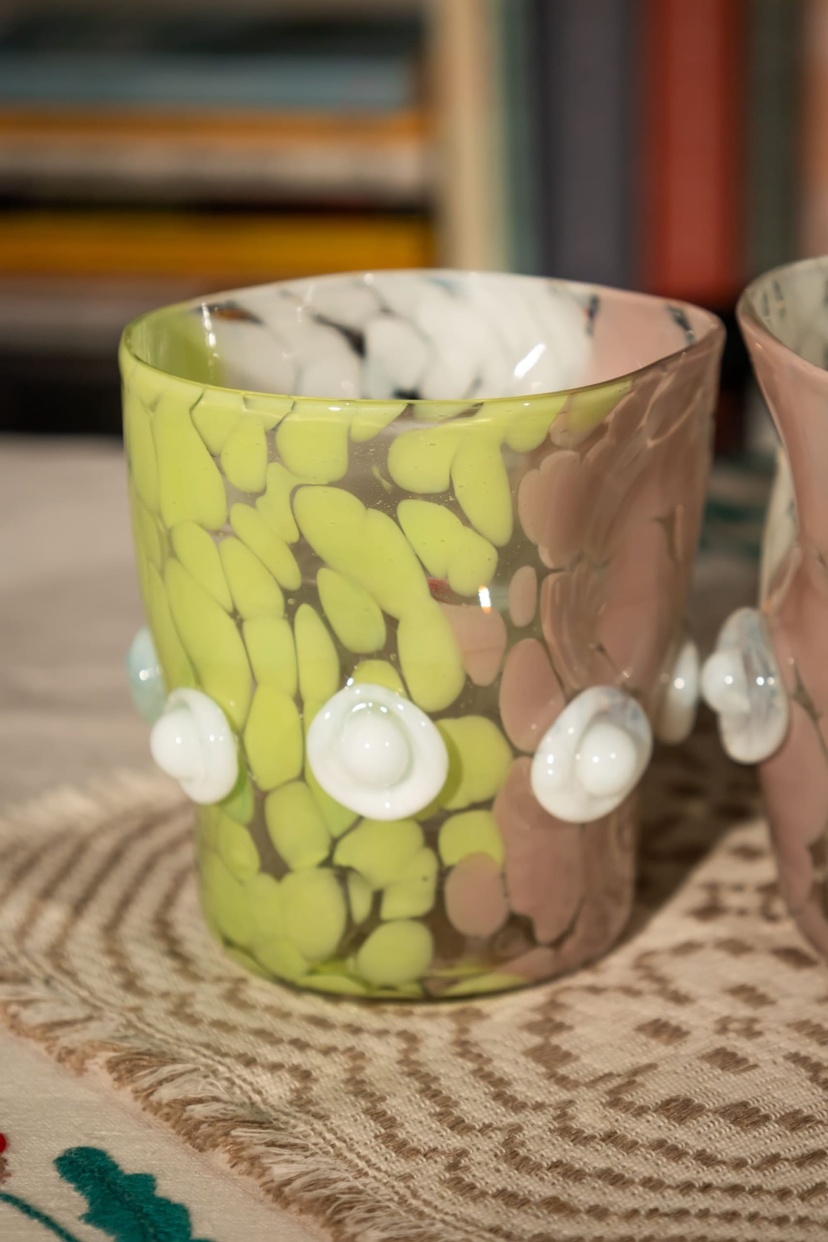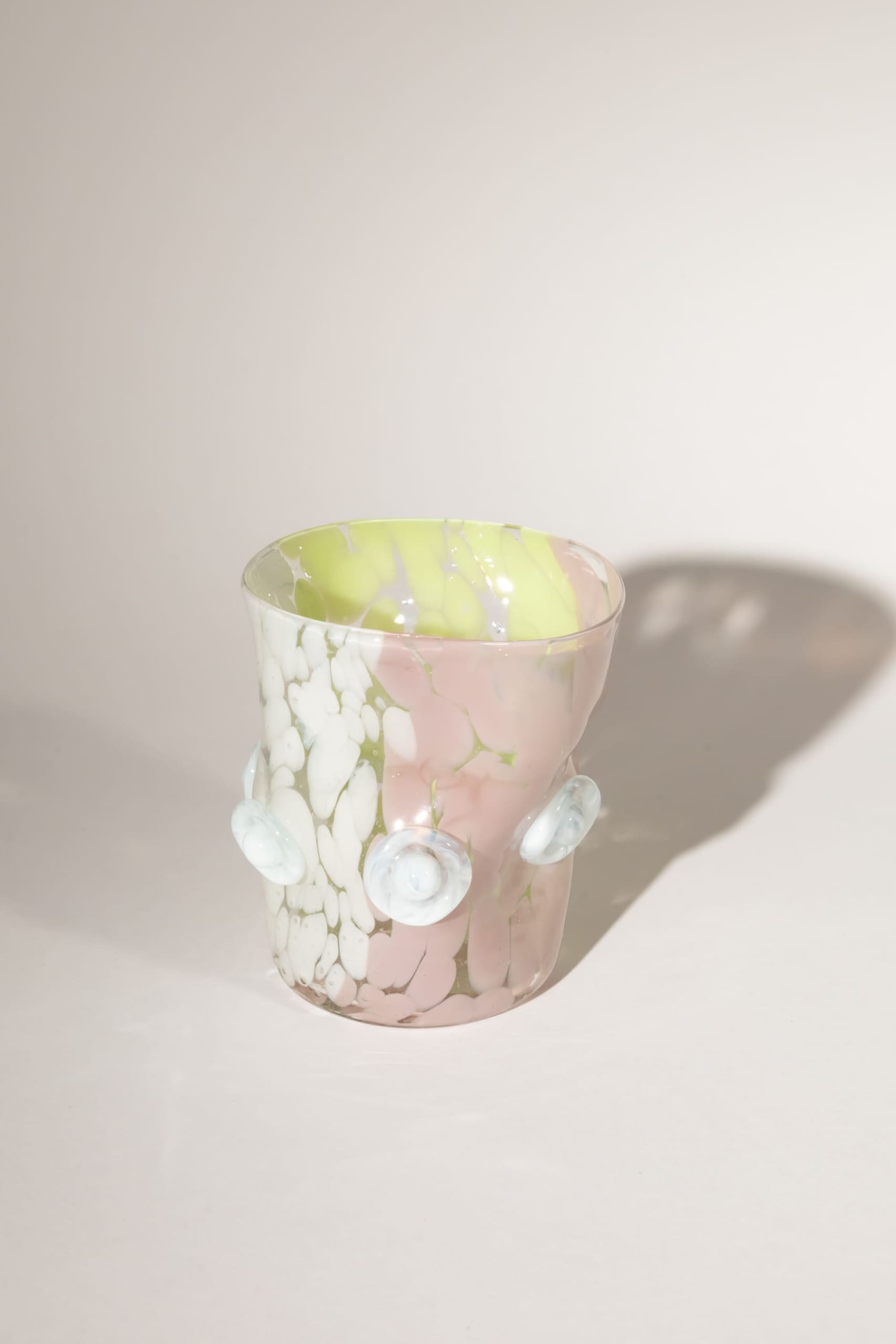 Each piece features an abstract, sculptural, rule-breaking shape inspired by Gaudí, brought to life through a playful mix of colours – white, lilac and Chartreuse yellow – and tactile, applied white 3D details. No two glasses are alike, every piece is entirely unique – a one-of-a-kind collectible.
