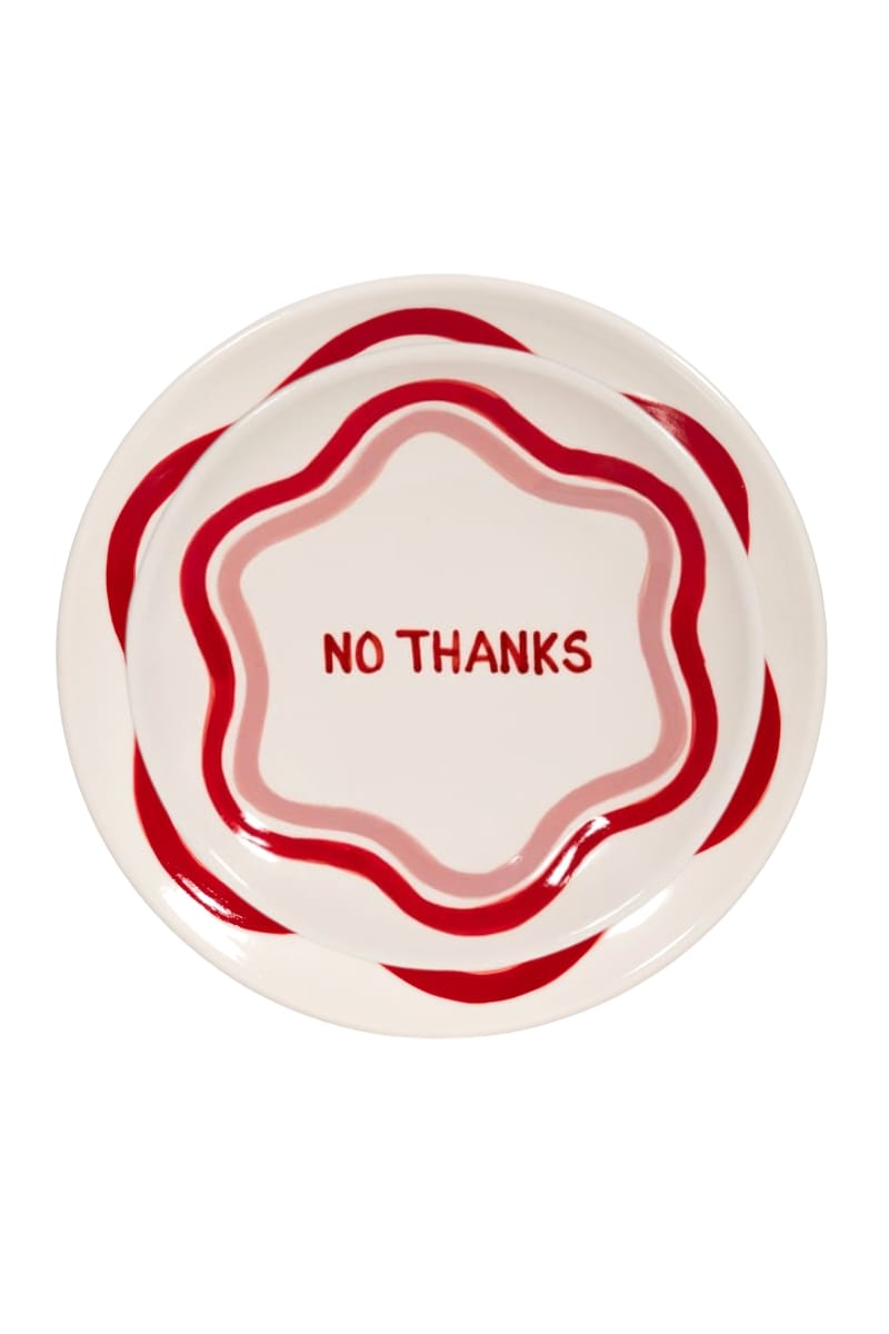 The set includes a set of 2 plates (1x dinner plate and 1x dessert plate) with the UNIMPRESSED (dinner plate) & NO THANKS (dessert plate) texts.