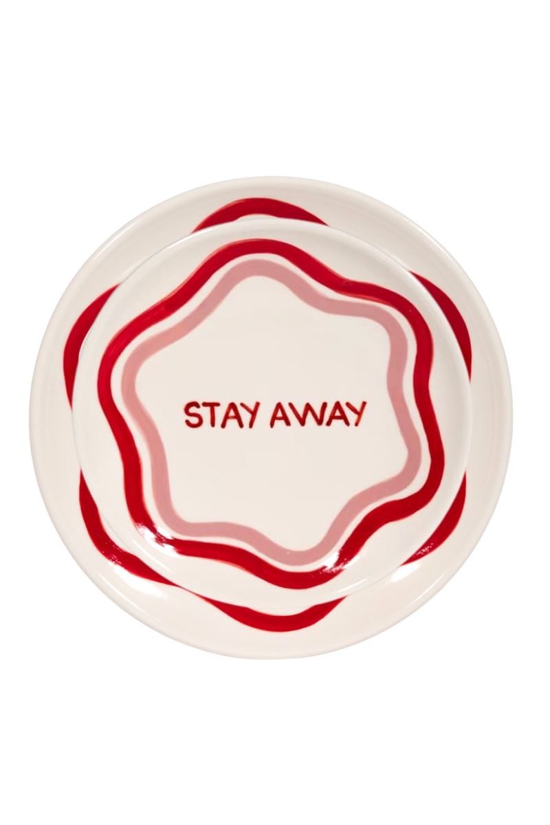 The set includes a set of 2 plates (1x dinner plate and 1x dessert plate) with the I’M NOT DONE (dinner plate) & STAY AWAY (dessert plate) texts.