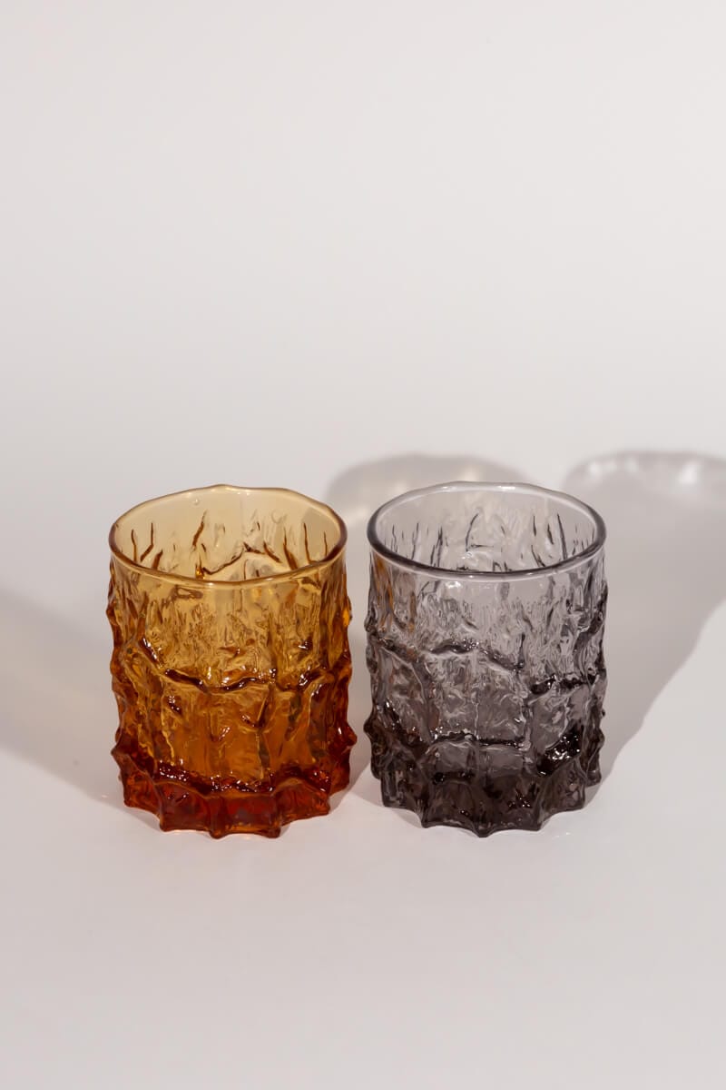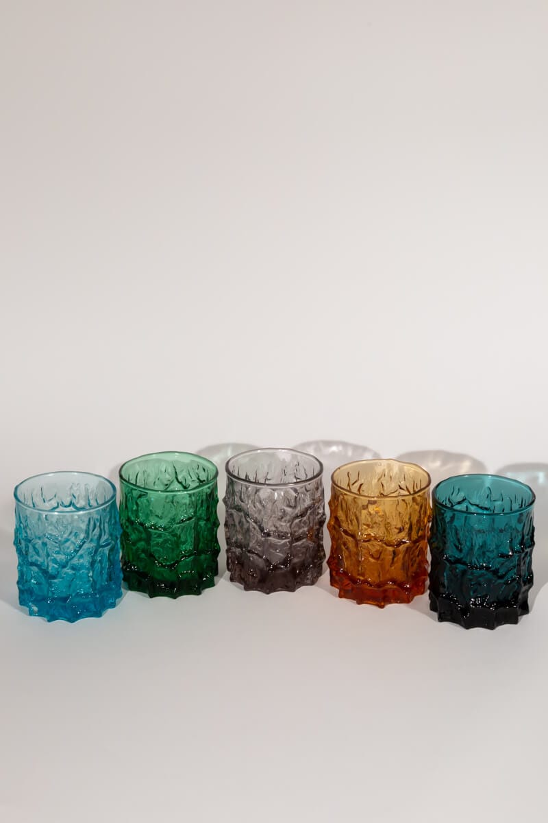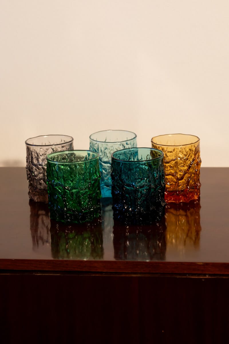 Elevate your glassware collection with this rare set of five Textured Bark tumblers by the iconic Geoffrey Baxter. Crafted in the 1960s by Whitefriars, the renowned glass factory in Wealdstone, North London, these whiskey-style glasses are a celebration of mid-century design. Each tumbler showcases Baxter’s signature bark-like texture and comes in an enchanting mix of shades: light blue, amber, amethyst, and two tones of green.