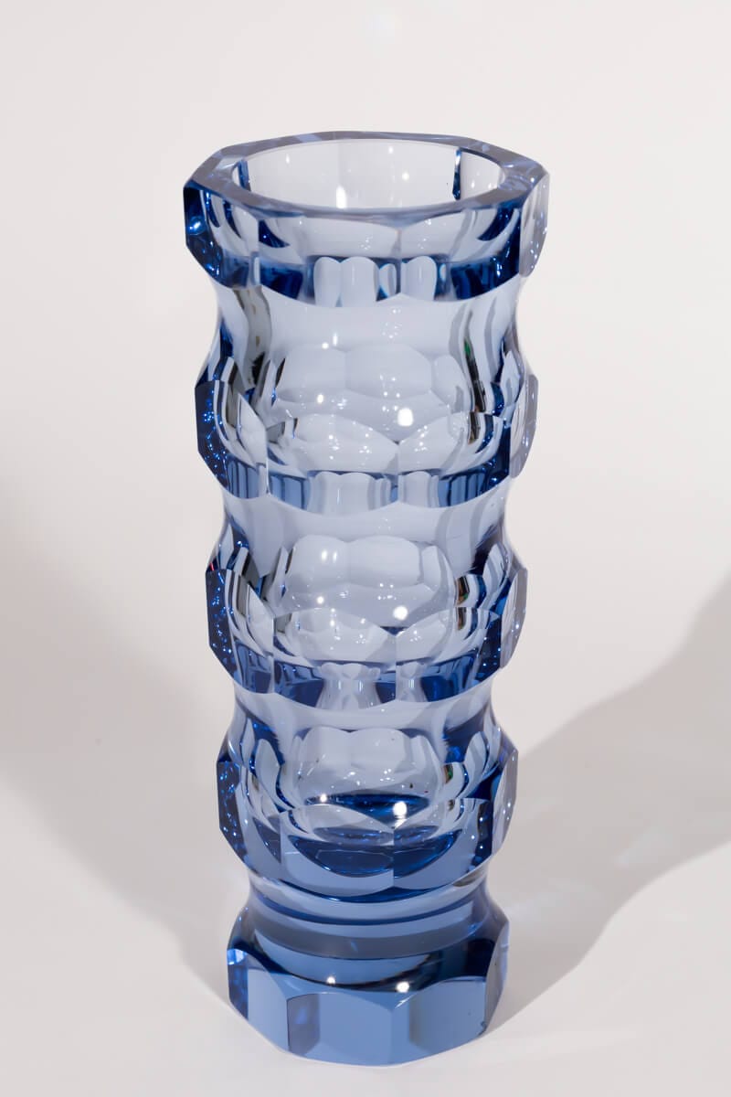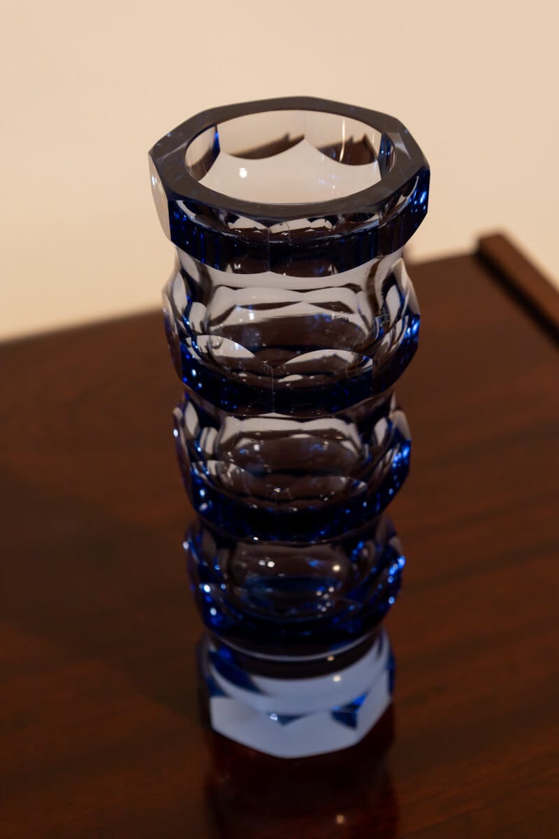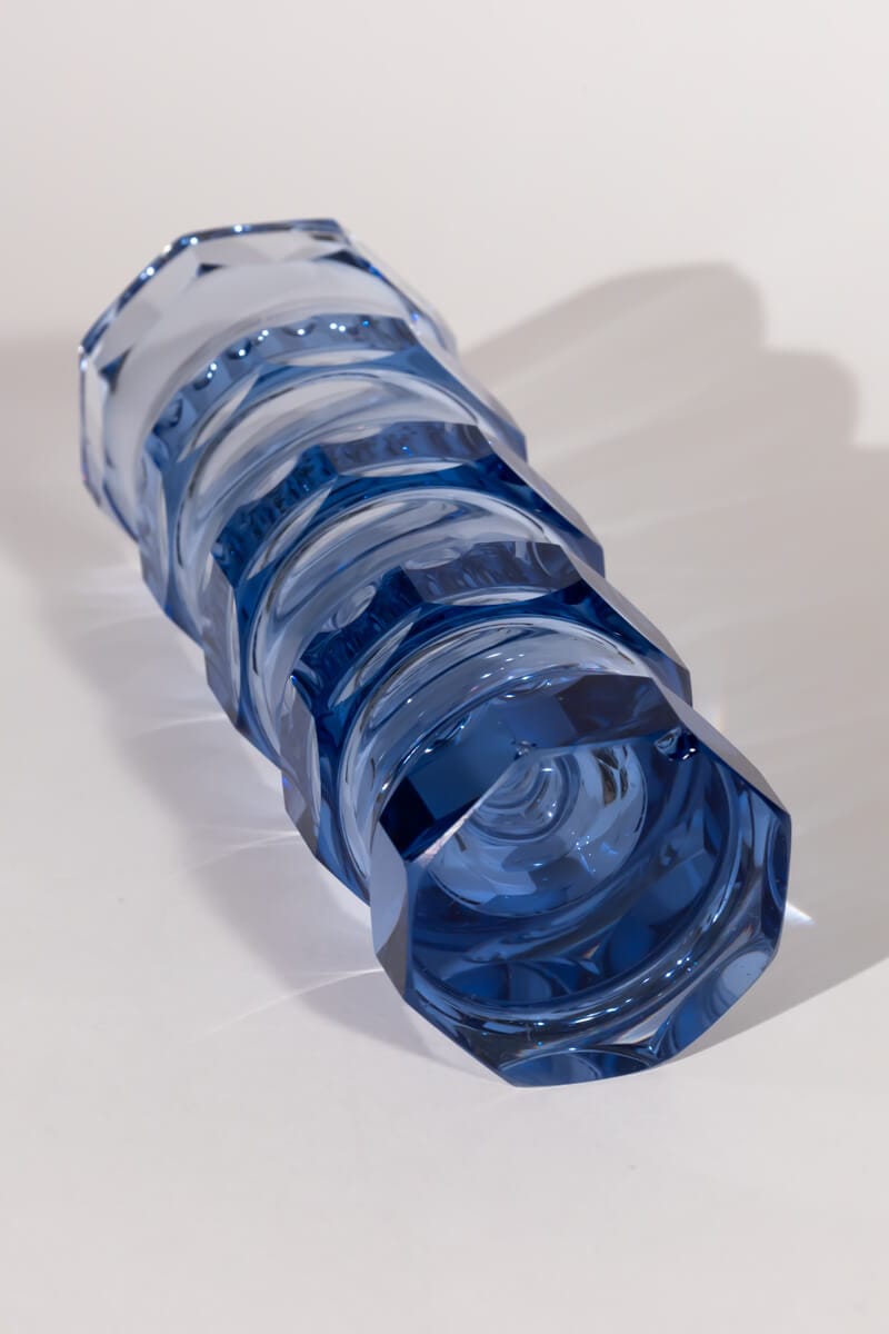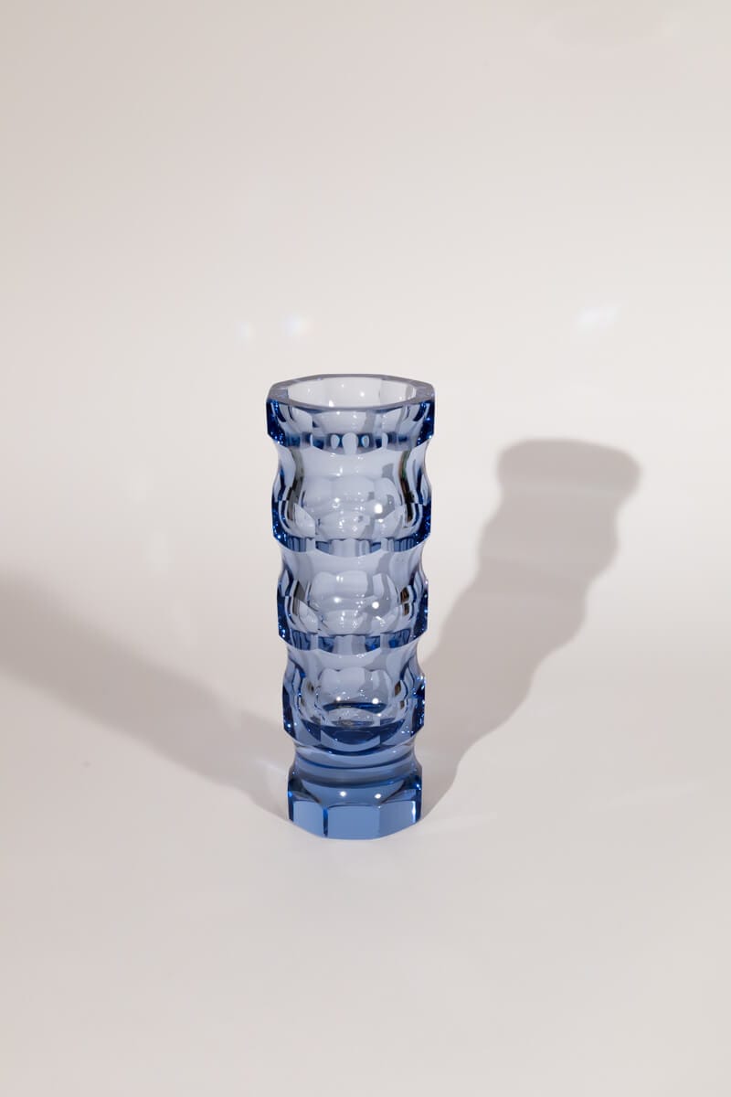 Bring a touch of retro charm to your space with this rare faceted crystal vase by Oldřich Lípský for VEB Glaswerke Schmiedefeld. Designed in the iconic 1970s style of the former GDR, this exquisite vase is crafted from blue crystal glass and features an elegant octagonal facet cut that beautifully catches and reflects the light.